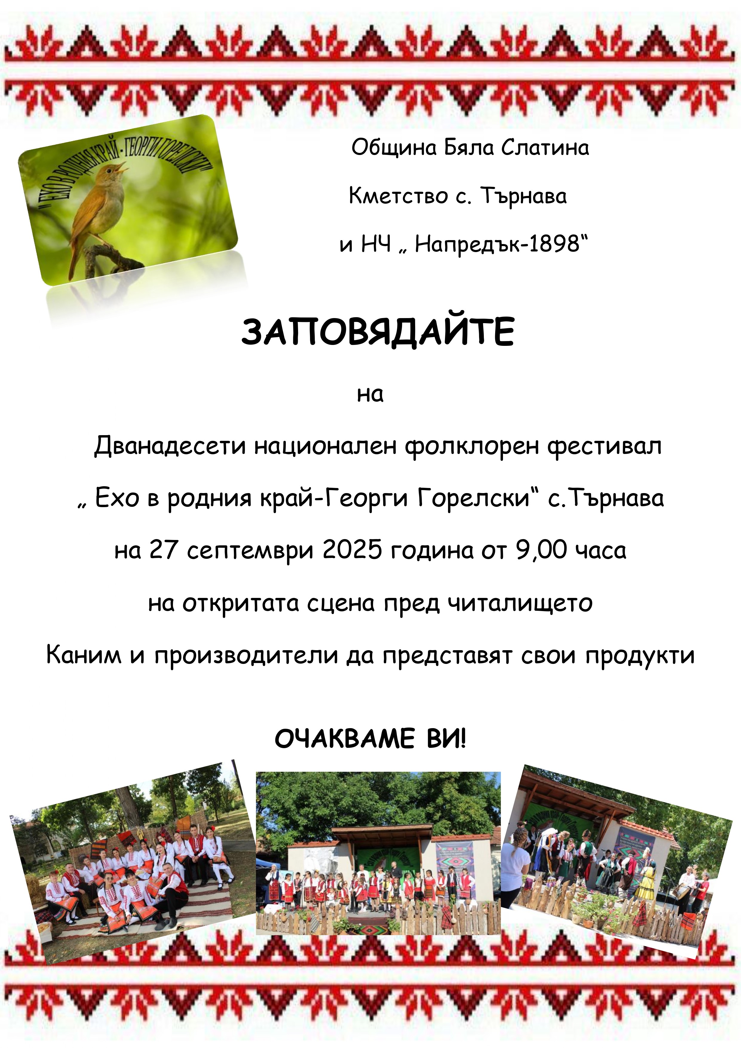 Заповядайте на XII Национален фолклорен фестивал "Ехо в родния край - Георги Горелски" с. Търнава