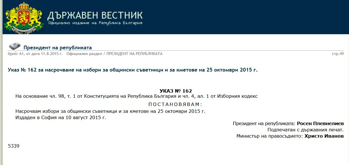 Хронограма за изборите за общински съветници и за кметове на 25 октомври 2015 г.