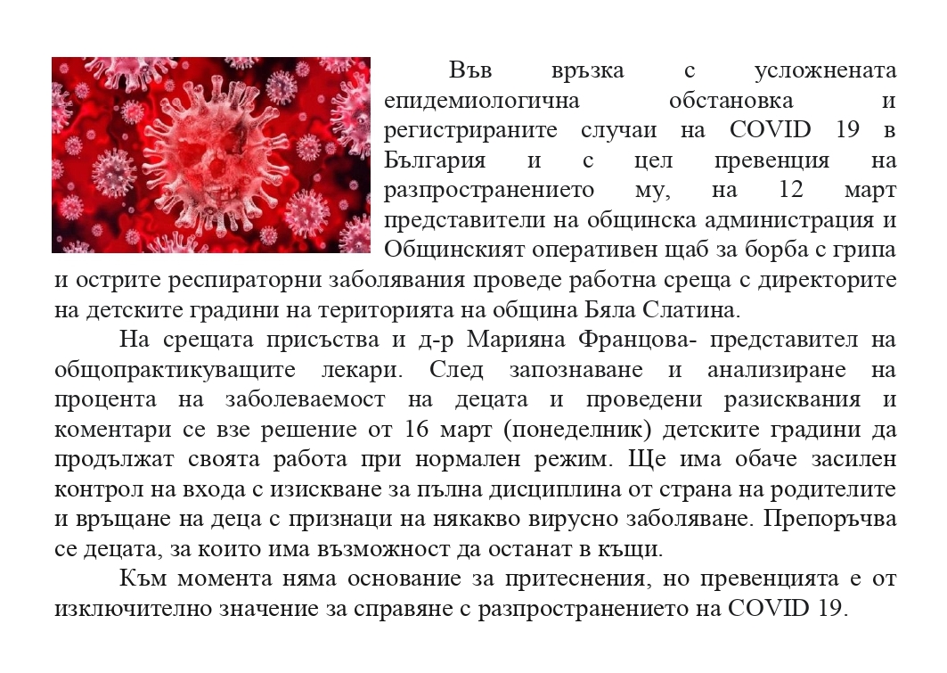12.03.2020 г. Във връзка с усложнената епидемиологична обстановка Общинския оперативен щаб за борба с грипа и острите респираторни заболявания проведе работна среща с директорите на детските градини на територията на община Бяла Слатина