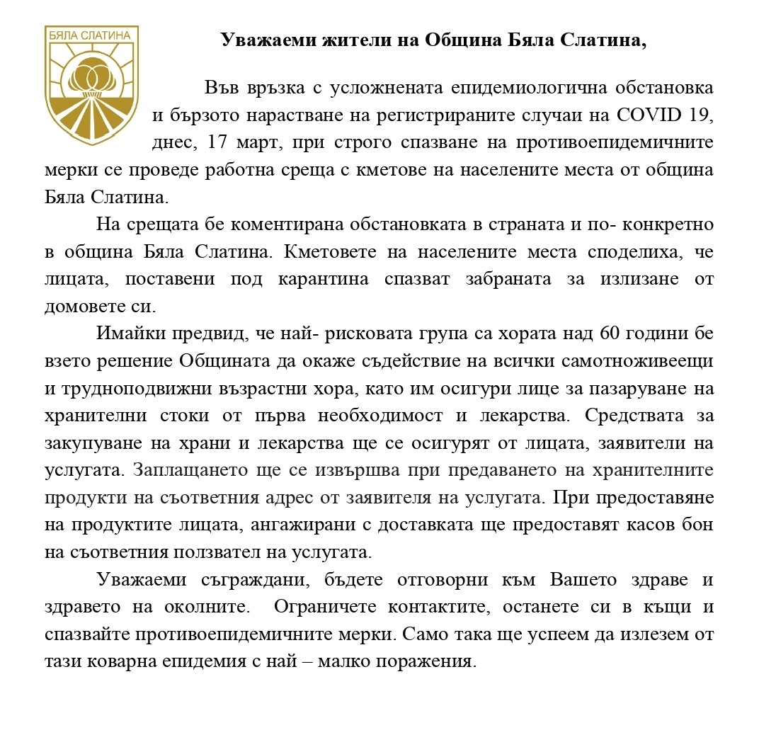 Във връзка с усложнената епидемиологична обстановка и бързото увеличаване на регистрираните случаи на коронавирус в Република България Община Бяла Слатина организира предоставянето на подкрепа на самотноживеещи и трудноподвижни възрастни хора, които имат нужда от закупуване на хранителни продукти от първа необходимост и медикаменти, включително и такива, изписани с рецепта или рецептурна книжка.