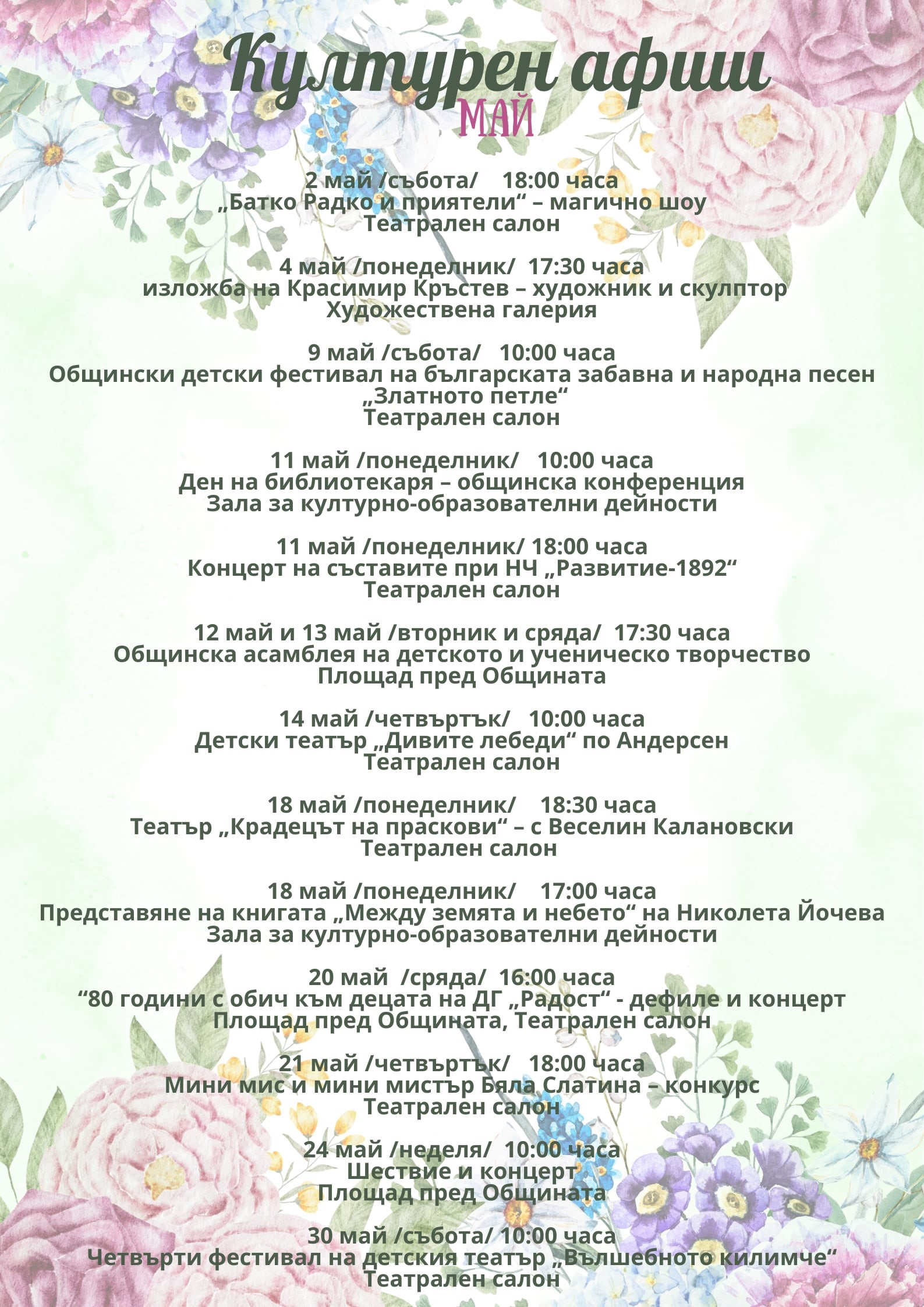Община Бяла Слатина. Културен афиш за м. Май 2026
