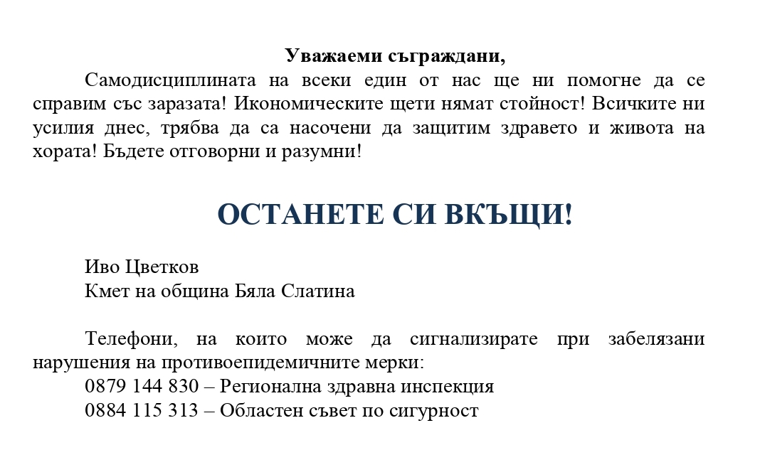 18.03.2020 г. Уважаеми съграждани, останете си вкъщи